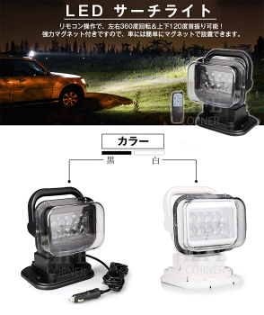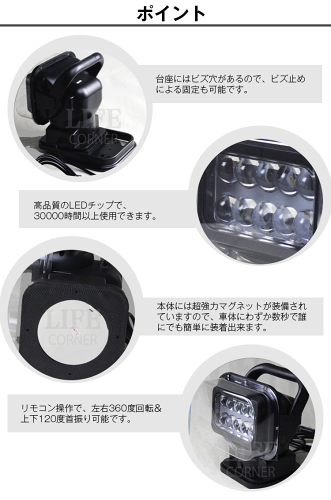 今、大注目!!イチ押し商品!! アイテム情報 商品仕様 LEDパワー: CREE LED 10pcs * 5W = 50W 商 品 名: CREE LED サーチライト 50W 本 体 色: 白色 照 射 角: 左右回転 360度 ・ 首振り回転 120度 明 る さ: (約) 3200LM 発 光 色: 昼光色(6000K-6500K) LED 寿命: (約) 50000時間 配線長さ: (約) 2.8m 照射距離: (約) 450m 動作電圧: DC12-24V 防水仕様: IP65 (生活防水) 角度調整: 上下左右調節可能 重 さ: (約) 3.5KG 本体素材: プラスチック、レンズ材料PC 商品ポイント ☞ リモコン操作で、左右360度回転&上下120度首振り可能! ☞ 強力マグネット付きので、車には簡単にマグネットで設置できます。